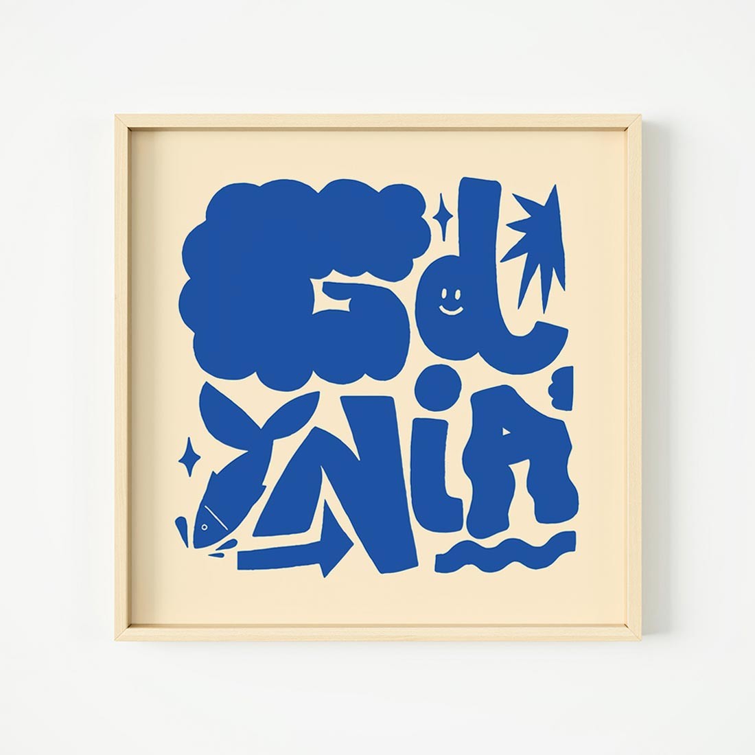 Typograficzny plakat Przemka Sokołowskiego - gra skojarzeń z Gdynią: fale, ryby, chmury, gwiazdy. Idealny plakat dla miłośników nadmorskich miast, który wprowadzi radosny klimat do wnętrz.
