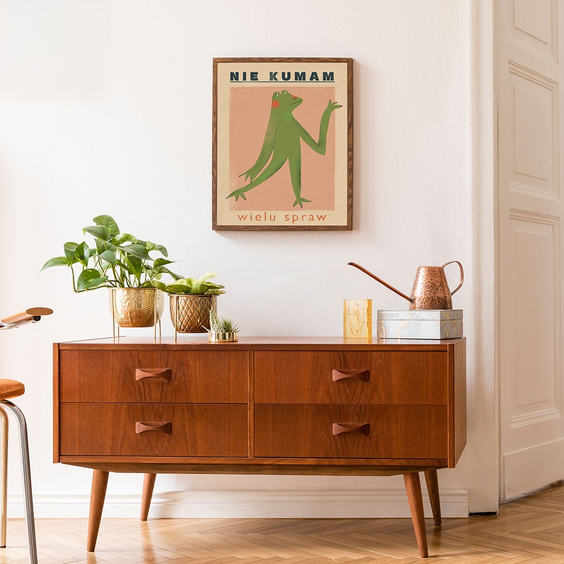 Zabawny i pełen dystansu plakat autorstwa Magdy Krupy, który z wdziękiem przełamuje schematy klasycznych plakatów motywacyjnych. Zamiast złotych rad – szczere wyznanie. Delikatna faktura tła i przygaszona kolorystyka nadają tej grafice wyraźną nutkę vintage, która świetnie komponuje się z naturalnymi materiałami, retro meblami i przestrzeniami, w których liczy się klimat.