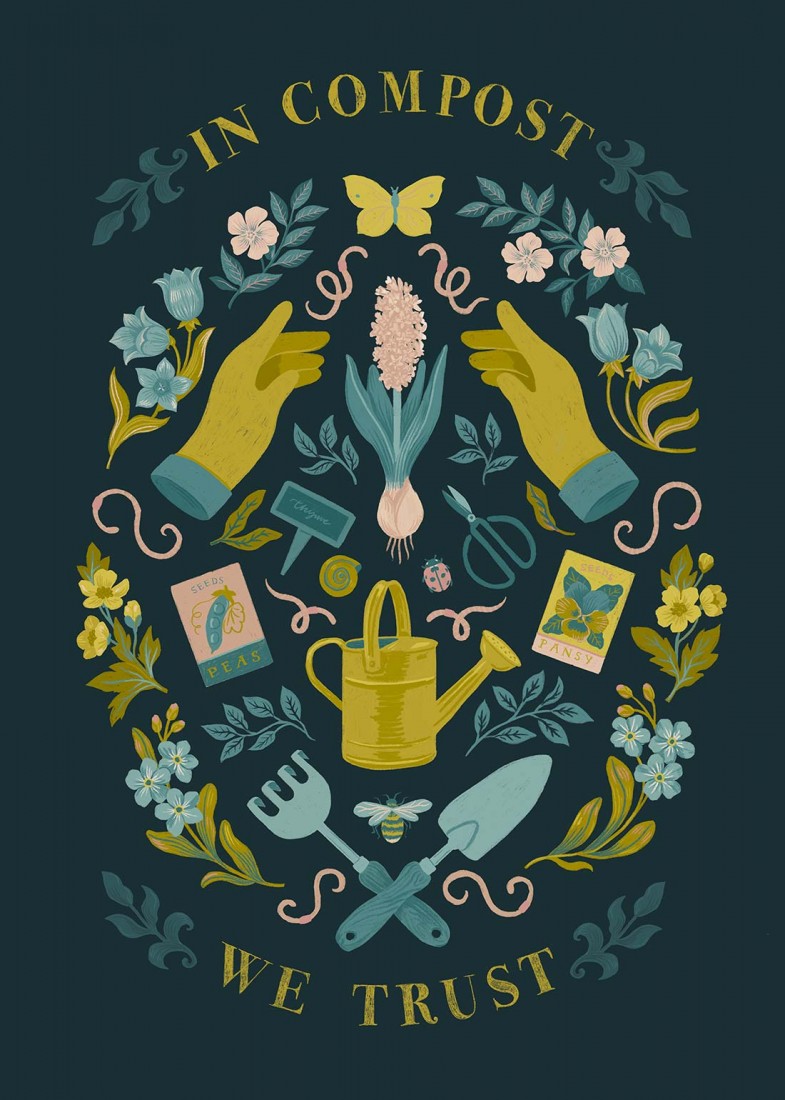 Plakat dla miłośników ogrodów i natury. Dłonie w ogrodniczych rękawicach, konewka, nożyce, kwiaty, motyle i napis "In Compost We Trust" – Ola Ogorzałek tworzy grafikę pełną miłości do ogrodnictwa. Plakat do salonu, kuchni czy każdej przestrzeni, która potrzebuje odrobiny natury i dobrej energii. Grafika dla miłośników roślin, ekologii i ilustracji, które mówią o tym, że prawdziwa magia dzieje się w ziemi.